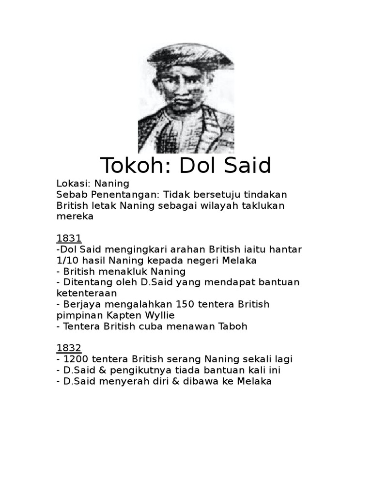 Biodata dol said nama sebenar dato' naning abdul said bin omar tempat tinggalnya di daerah naning jawatannya adalah sebagai penghulu dol said jaya mengalahkan british. Eduwebtv sejarah dato maharaja lela pejuang terbilang. Lagenda pahlawan naning dato' dol said | sejarah ringkas tokoh ulama silam & pahlawan melayu. For both war, there are different sequences and tactics that using by dol said pahlawan nanings. Ini kerana dol said memiliki sifat berpantang mati sebelum ajal.