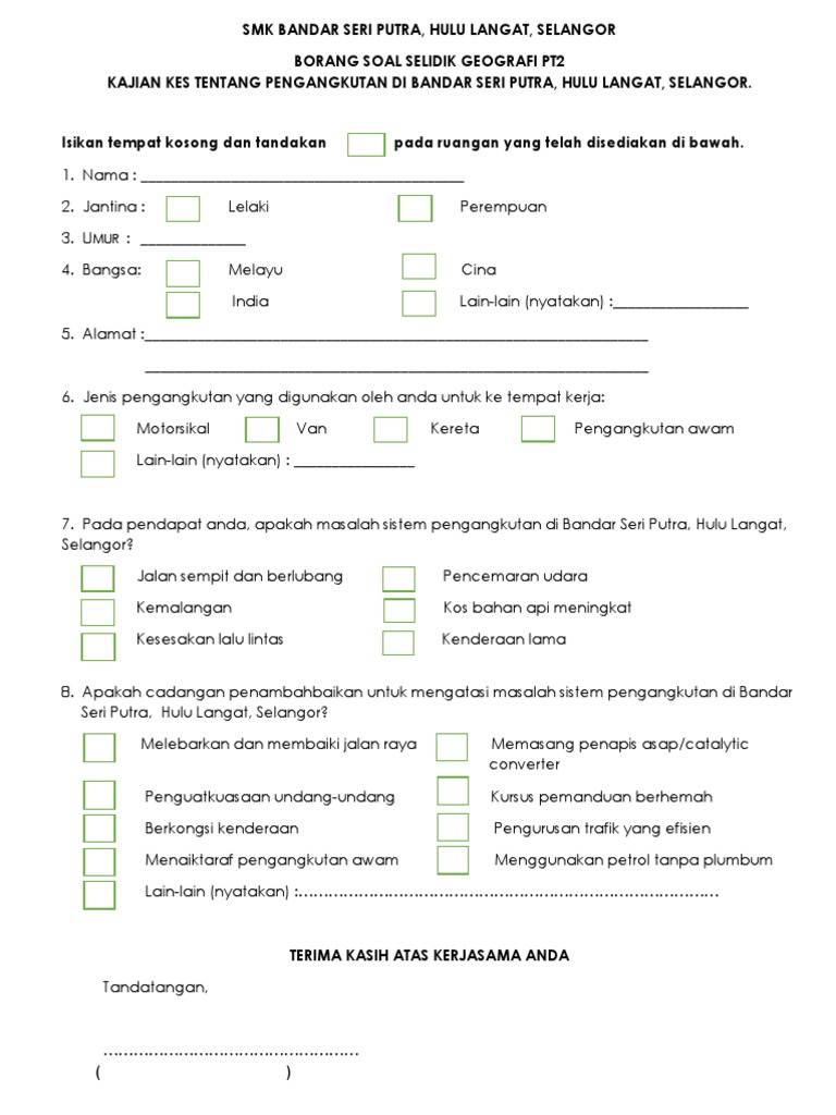 Penguasaan haqiqah dan majaz dalam kalangan. Borang soal selidik pengangkutan tugasan geografi pt3 2016 via babab.net. Semoga perkongsian bahan bahan rujukan, panduan, bahan pembelajaran dan pengajaran, contoh contoh karangan, sumber rujukan pt3 (pentaksiran tingkatan 3), tingkatan 1, tingkatan 2. Sistem pendidikan sebelum kedatangan british. Temu bual terbahagi kepada 3jenis iaitu temu bual formal, temu. Borang kaji atau soal selidik ini perlu dibuat dalam perlaksanaan dan disertakan dalam pelaporan tugasan wajib bagi ujian pelbagai instrumen (geografi) pentaksiran tingkatan 3 (pt3) kajian lapangan atau lebih dikenali sebagai kerja kursus, agar menjelaskan lagi hasil dapatan dan maklumat yang. Peningkatan kos pengangkutan memberi kesan negatif kepada pengguna. Contoh rumusan tugasan geografi pt3 2016. Smk malim nawar borang soal selidik nama. Apakah tindakan manusia yang boleh menyebabkan krisis air ? Kerjasama anda melengkapkan borang soal selidik ini didahulukan dengan ucapan ribuan terima kasih. Soal selidik ini adalah bagi memenuhi kerja kursus mata pelajaran pengajian am 900/4. Please copy and paste this embed script to where you want to embed.